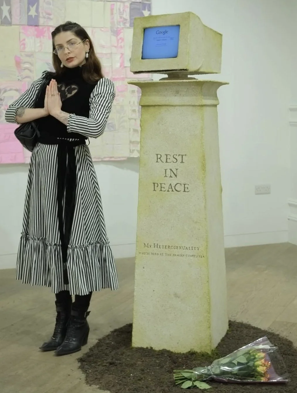 The sculpture takes the form of a gravestone-like monument topped with a handbuilt CRT computer monitor displaying an early Google search for “girls kissing”. The work recalls the moment, aged around eight or nine, when